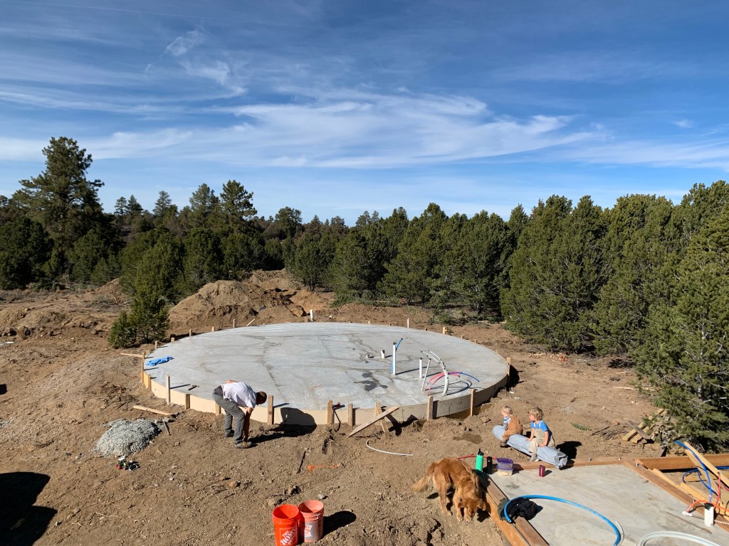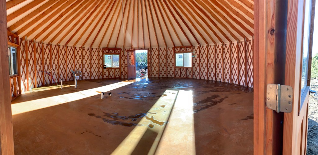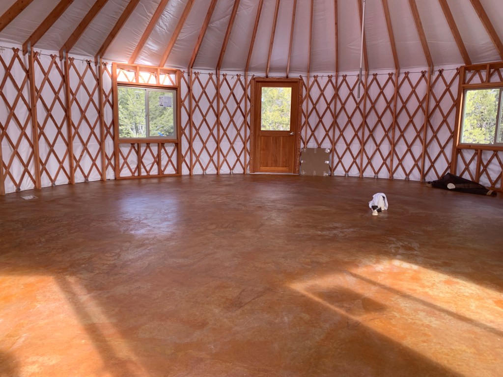 Before I get into the actual yurt pitch, I wanted to share the process of staining our concrete! We stayed at an Airbnb close by the property when we were land hunting in 2019, and they had concrete heated floors. And it really seemed like such a practical floor for us! Unless you have a really big mud room entrance, it’s inevitable that the floors are going to get pretty filthy being in Colorado in the middle of nature. I also wanted a lighter color floor to hide the dirt and footprints because I know I’m not going to mop every day.