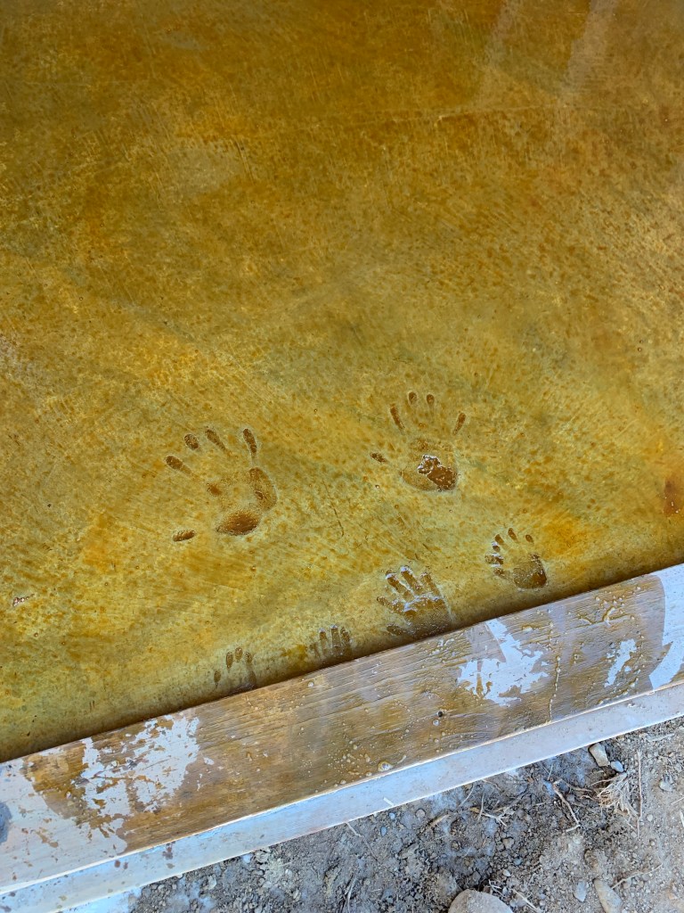 AfterFamily handprints in the shed. We had leftover stain so we stained the shed floor too. Some marbling showing through.