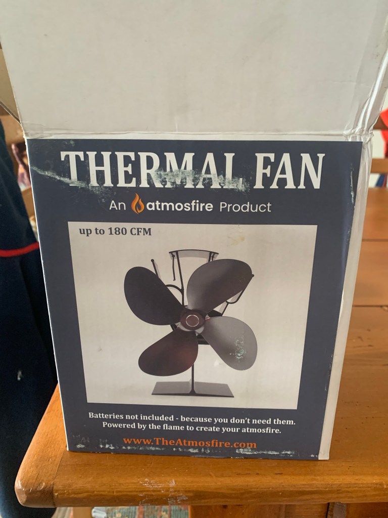 This thing is so awesome! It’s a thermal metal fan you put on top of the wood stove to blow the heat around. Our old wood stove had an electric blower, so this is perfect to save some of our solar energy.