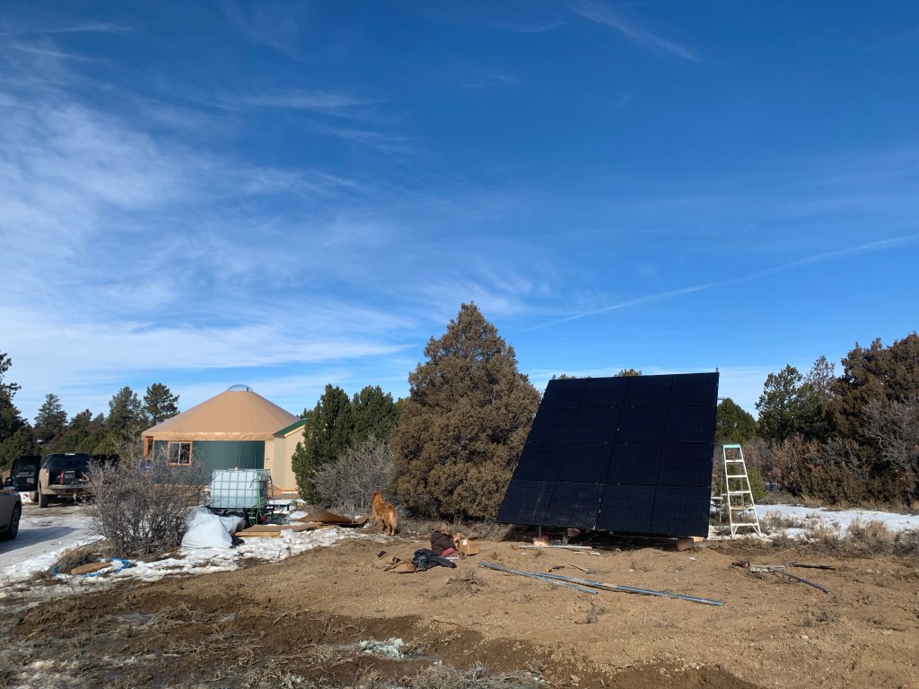 Electricity update: Our solar panels are up! We installed them right before Christmas. We also have the electric wiring pulled through to the shed where our batteries and panel are. The only thing left to do is pull the wire from the shed to the yurt now. Pulling the wires from the panels to the shed was a mission. Our neighbor accidentally cut the electric pipe awhile back, which cut the string that ran through the whole pipe. So we did this vacuum trick where you put the vacuum hose on the end of the pipe in the shed, and it pulled a plastic bag tied to the string so we could get the wire through.