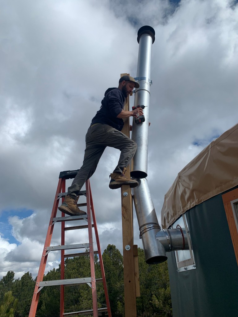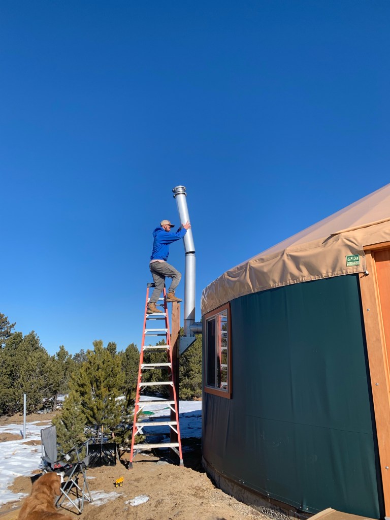 We had to cut a hole in the yurt to put the wood stove pipe in. That was nerve wrecking! But it turned out great. Je made us a nice, super strong support for the stove pipe outside. I may try to stain the wood supports this summer so they match the yurt trim, but that’s on my long list of not so important things to do.