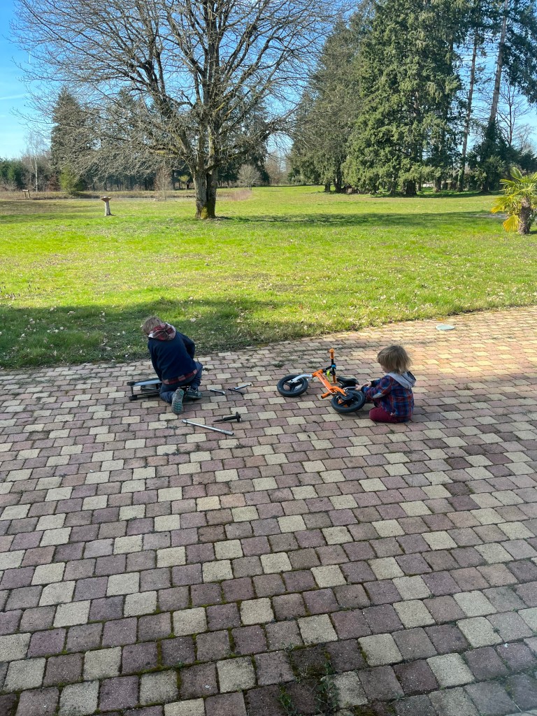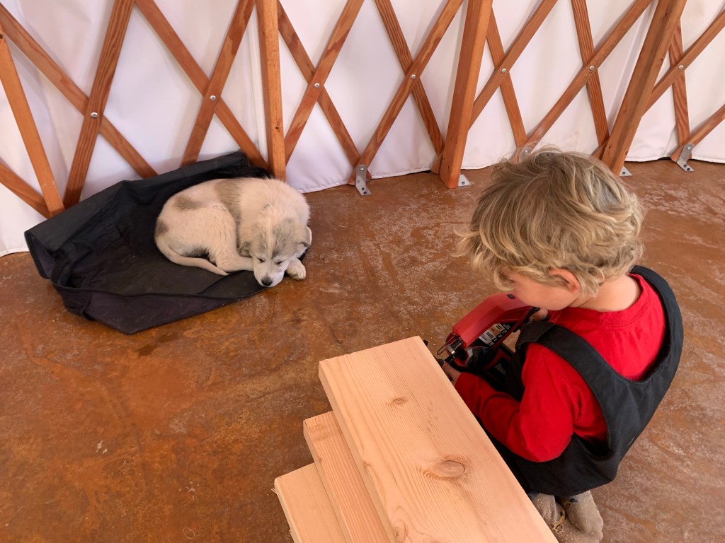 After we finish the boys room, I’ll be able to help Je a little more. Hugo has been fine when we’re at the yurt as long as he has a hammer or a drill, but Marceau at his age (almost 2) is so difficult when we’re there.