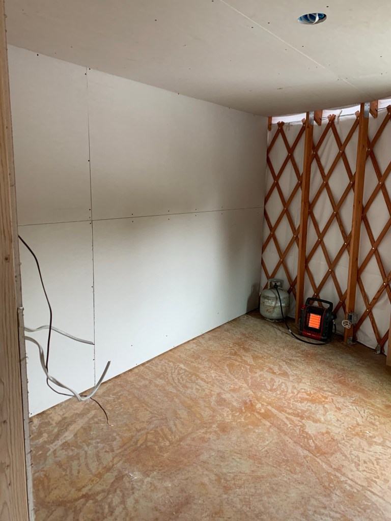 The boys room! Je is mudding the walls as we speak, then we can paint. We’re trying to finish this room first so Marceau can nap in here while we work on other parts of the yurt.