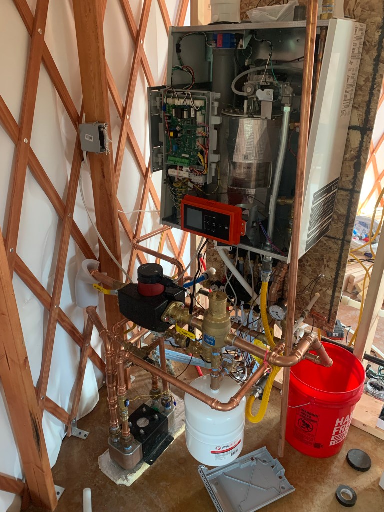 Let’s talk about heat! Boy does our wood stove work well! We have it running every day pretty much. I like to be extra warm and sometimes I smoke Je out and he has to open the doors to cool it off. But at any rate, we’re not cold that’s for sure. Some mornings we’ll wake up and it’s in the 50s inside, but that’s just because we don’t stoke the fire during the night. The in floor heat is working wonderfully, but we are definitely crushing through propane because the slab isn’t insulated like a house, and the walls of the yurt are not as insulated as a house. But it’s only temporary living until we have our house built.