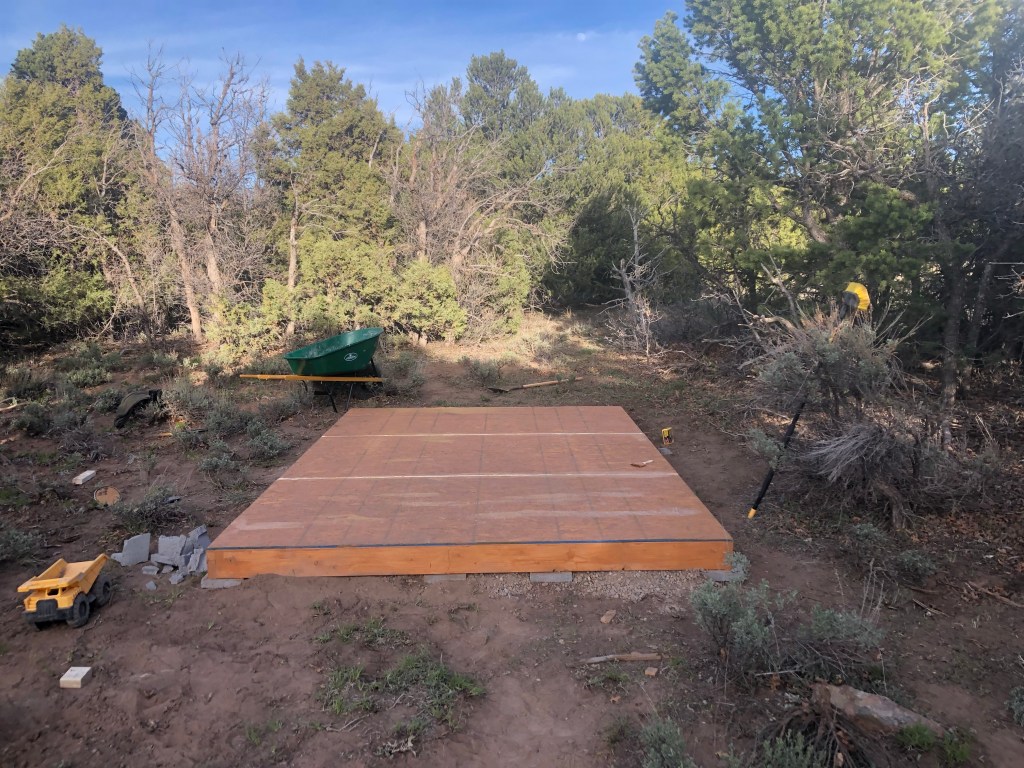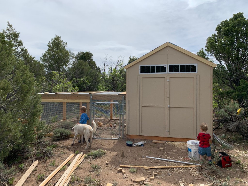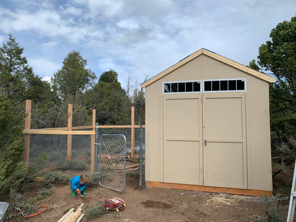 We started the coop two weekends ago and it’s the same shed kit we used for the utility shed outside the yurt. Only difference is that the utility shed has a concrete floor with in floor heating, and the coop is just a wood base.