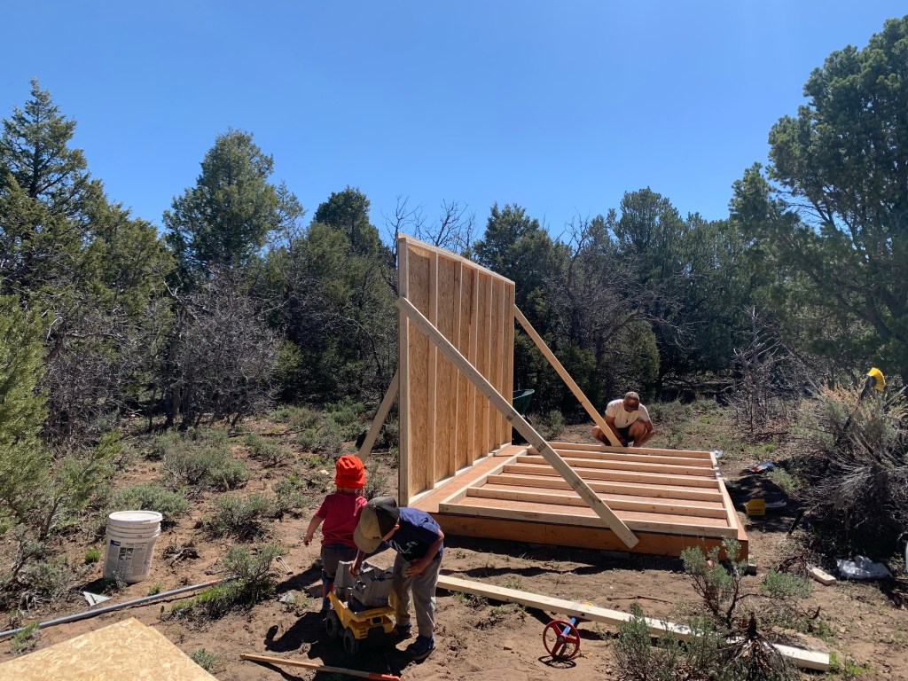 Kitchen in front and bathroom behindCan’t decide if we’re helping Je, or just delaying him 😆Walls are in- now for the joists.
