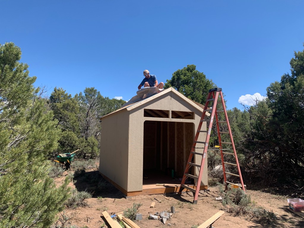 We stained the plywood floor thinking it may make the wood last a bit longer. We picked a day without wind to put the shed up. Lesson learned (for the newbies, our first go at the utility shed took two tries because of the wind).Enjoying the warm weatherJe laying down the roof liner before placing the metal roof. Looking for coyotes