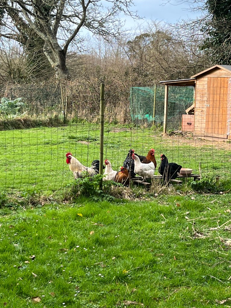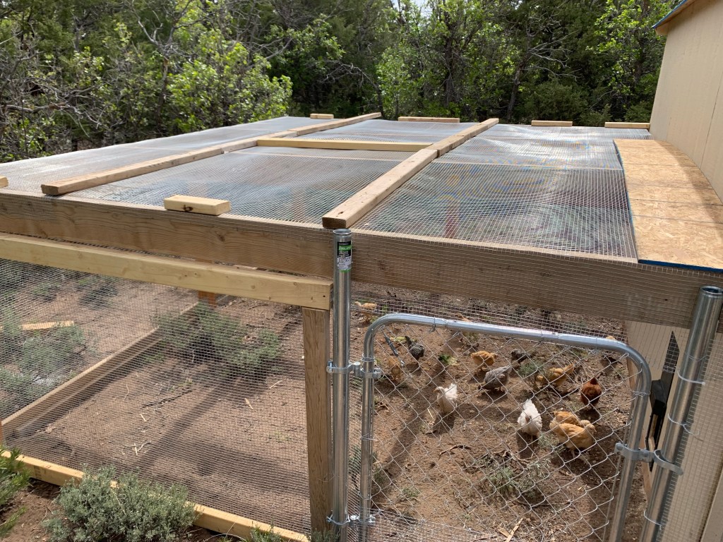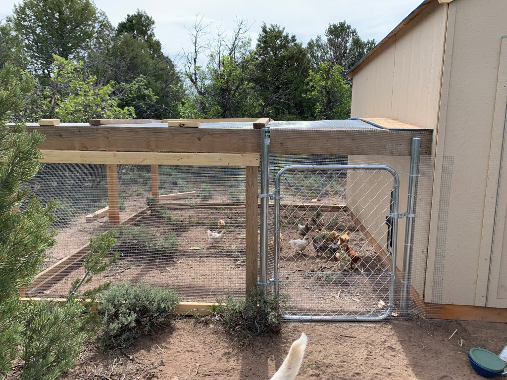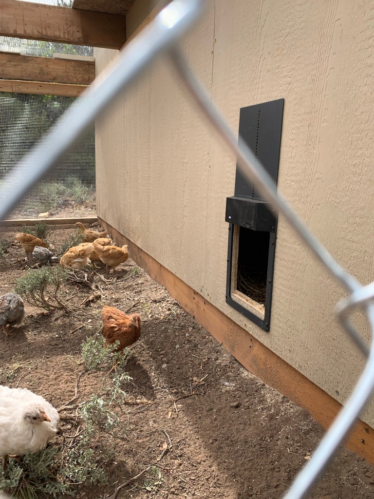 We have 3 locks on the coop door to hopefully stop any bear (they can open car doors!)Marceau trying to catch a chickWe dug a trench along the perimeter and filled it with concrete. Hopefully now a predator won’t dig it’s way under the fence.Je covered the run and installed the automatic chicken door, so the chickens are happy campers now! So far we have 7 named- Alice, Clessy, Minnie, Pepper, Sven, President Snow and Tiny.