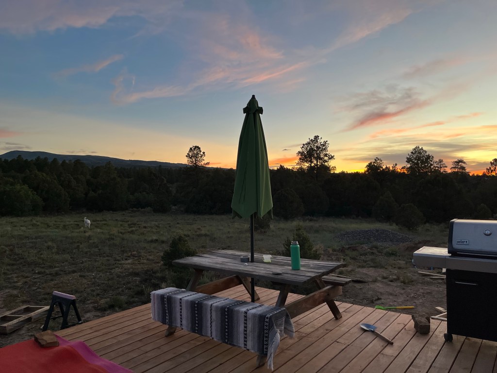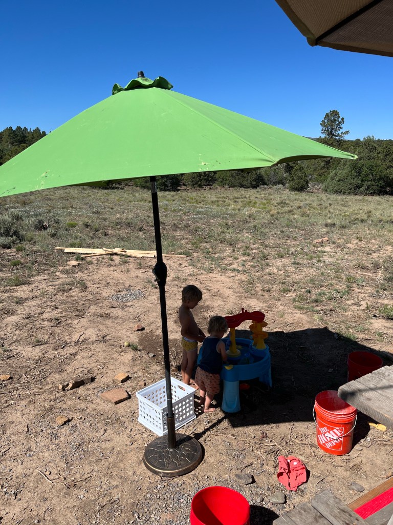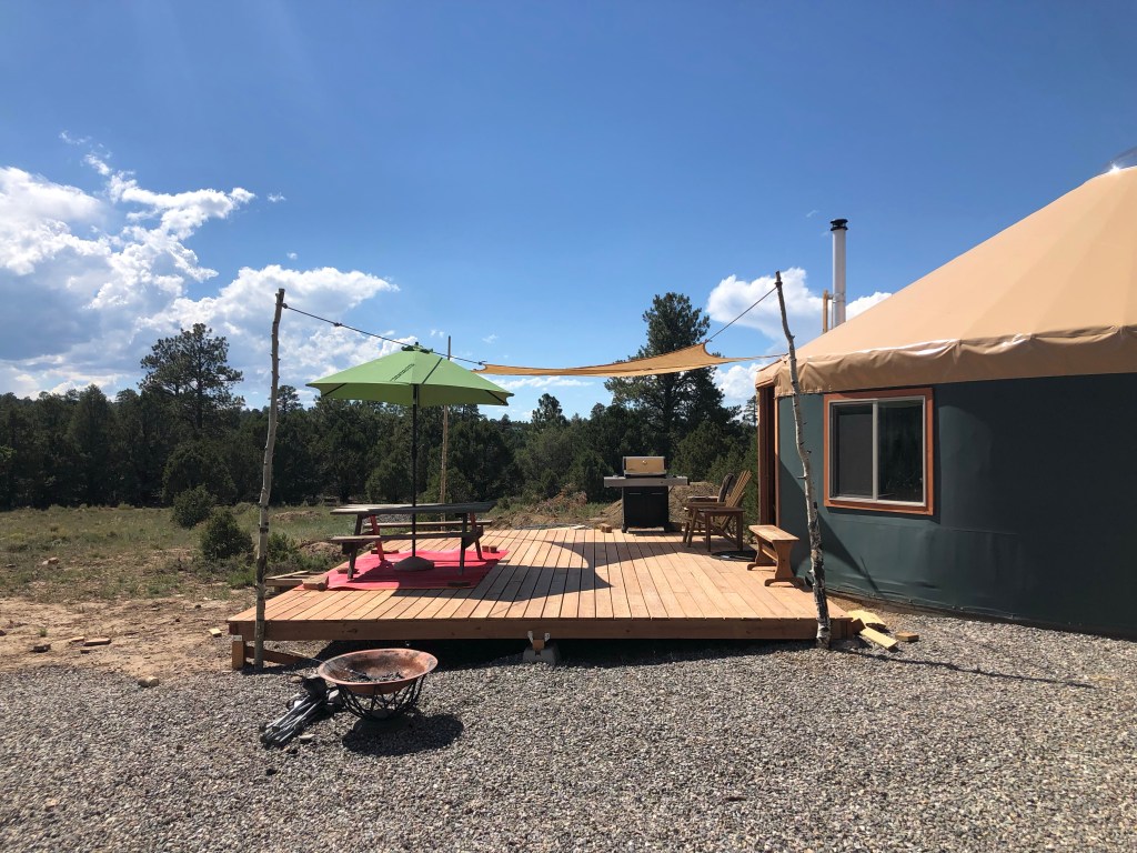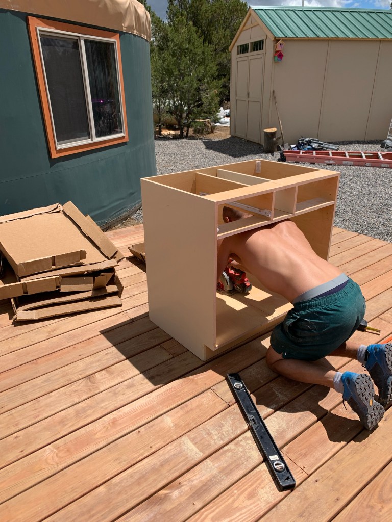 Framing the patioJe smoothed all the gravel out. Oo look how pretty it is! Patio is done! Who wants to do some mountain yoga? Play time while Gigi was in townPicnicking on our new patio! It’s awesome. The wood feels so nice under your bare feet. And so nice to not have to picnic in dust. Mochi and I had a girls night out and had a cocktailLove this view 🙂 The yurt is fully painted!! So excited. And we have a fan. It really keeps it cool inside.The bathroom utilities are hooked up and running! We’ll eventually build some sort of half wall to cover up all the plumbing, but that’s a detail. Not a priority now! Probably one of the only tasks I can do all on my own-Cutting the baseboards. We were going to stain them, but I think we’ll keep them the natural color for now. We bought a few cabinets and a sink from someone second hand, so we started piecing together our kitchen today. We had to cut one of the base cabinets in half so it fit.Voila! Close to a full kitchen! We just need to paint the cabinet and find a few second hand upper cabinets for storage. Eventually we’ll need a countertop but plywood will be just fine for now. Buddies