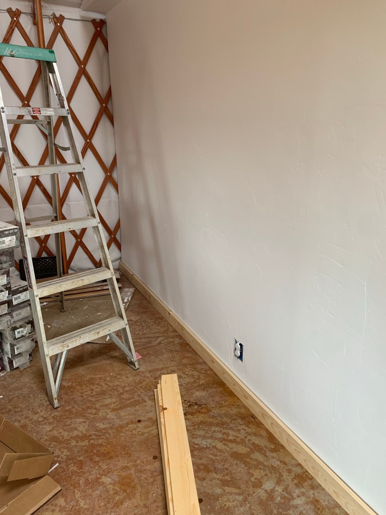 We’ve talked a lot about the layout of the yurt, and I’m such a visual person that it was hard to make a decision. We knew where the kitchen/bathroom wall had to be, so Je put that up and just went from there. Honestly, I feel like we could have done the layout 20 different ways and all of them would’ve been great. We’re good at adapting to whatever space we have. There is a back door in the yurt, so we also made a small pantry/back entrance which I think will be nice to have.