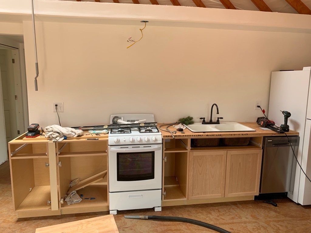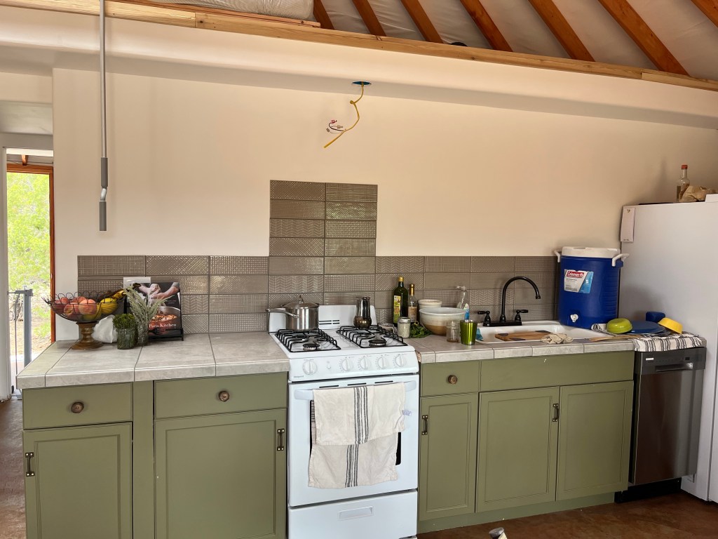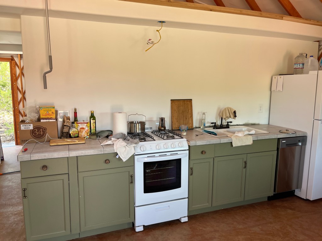 Kitchen wall- it’s now closed up. We bought a smaller oven (the same one I had in France) and a smaller dishwasher. It only uses a few gallons of water per cycle, so I thought that may even be better than hand washing for now. If we find we’re using too much water/energy with the dishwasher, we’ll just get rid of it.