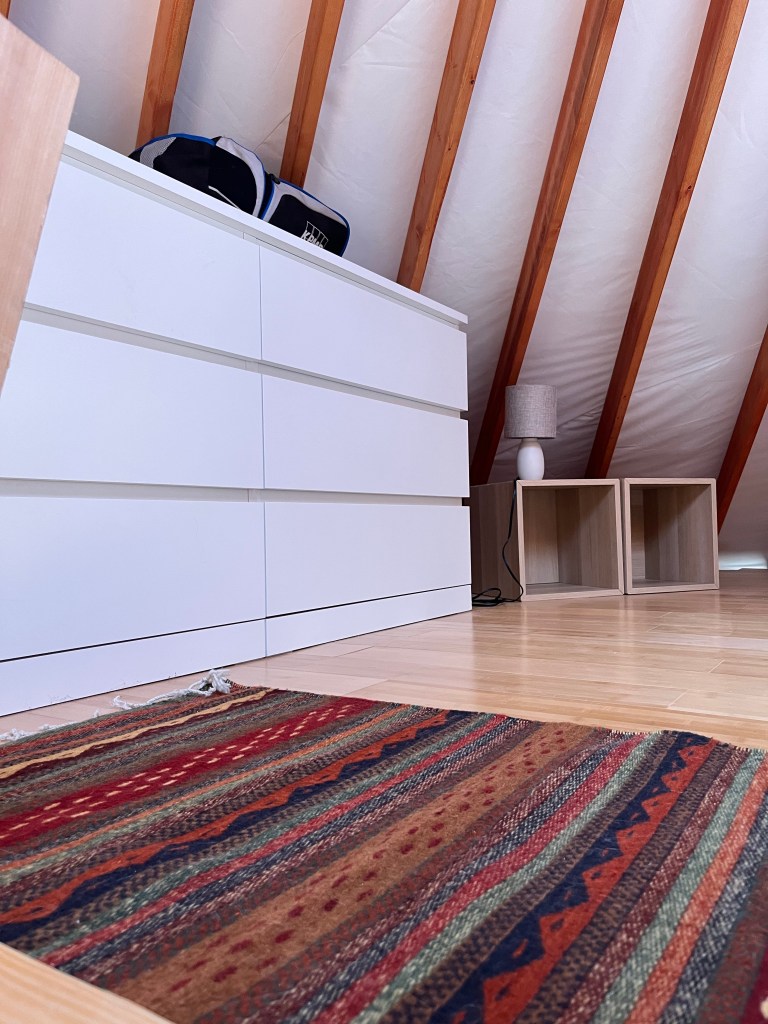 If you look closely at the ladder, there is a black hook on the right side (and left side). If you unhook that, you can fold the bottom half of the ladder up. We have to add some sort of hand rail on the side, but for now it’s good.I put the most slippery rug at the top of the ladder solely because it’s my favorite (fashion over function), but it’s a bit dicey. I probably need to put a rubber mat underneath. Pretty cozy, right?