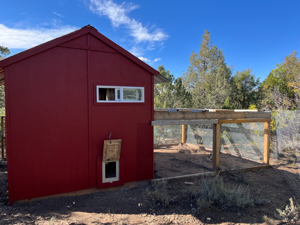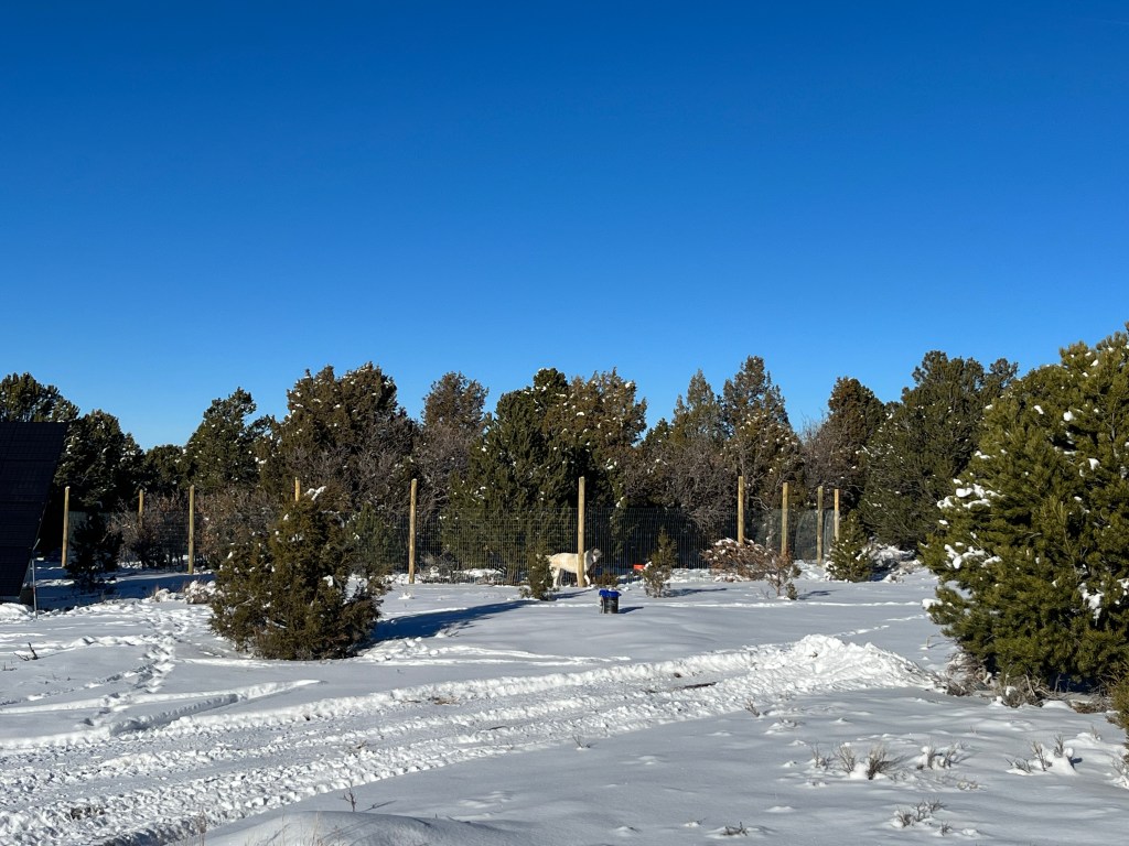 Hugo insisted on painting something red, so we did the chicken coop.Je made us a big chicken run, so now the chickens have a much bigger space to roam. But we only let them in it if Mochi is with them. Chicken run from another angle.Mochi’s patrol spot is either on the picnic table or the mound of dirt to the right.Sometimes our sunsets turn the snow pink! Super cozy in the loft The dogs collect skulls and old bones they find out on the property and bring them to the front yard. The other day we came down the driveway to a line of bones!