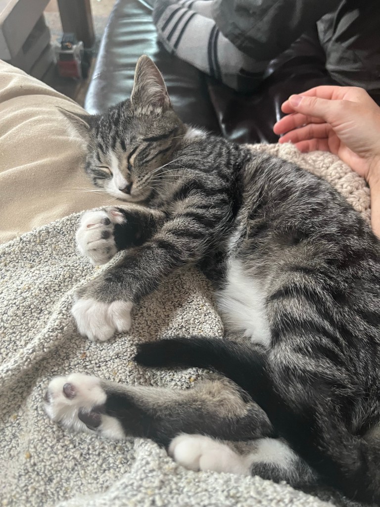 This is Bluey, or Bluette as we’ve nicknamed her. She’s Hugo’s cat. We also have a Bingo (Bingy-loo) who is all black but she’s not into snuggling. There’s Bingy-loo!