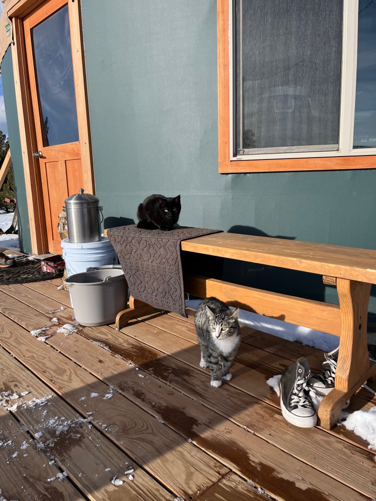 Smoothing the driveway/around the yurt to prepare for gravel. Our neighbor is bringing some over the next few days and then Je will smooth it out. We had to redo the chimney pipe bracing because the wind had started bending everything. I think it’s all good now.We’ve only named a few so far. But Alice, gray one in the top left , is my favorite 🤩