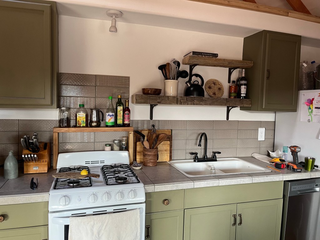 Kitchen update: we have countertops and a backsplash! I thought I could live with a plywood countertop longer, but I kept getting splinters. And we used the kitchen all day long, so it is nice to now have a wipeable surface. We decided on a tile countertop, but considered butcher block and stone/quartz. Tile countertops are pretty common in France. Je had them in his house in Bonson and they were really nice I thought. Tile countertops are also very inexpensive! It cost about $350 to do the countertop and the backsplash. Je did an awesome job on the tile job. The only imperfection in the tile is the small part I helped with that’s not at all straight!
